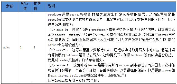 buffer.memory | 33554432 | 128M~1G | producer可以用来缓存数据的内存大小。如果数据产生速度大于向broker发送的速度,producer会阻塞或者抛出异常,以“block.on.buffer.full”来表明。 |