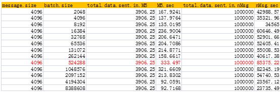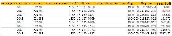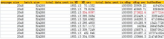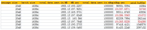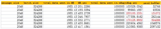 2. 在上面batch_size最好为512k 和 默认值的情况下,调整send.buffer.bytes,查看性能