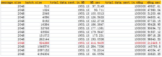 10G网卡下,2k数据,共发1000000条,线程数为10个,batchsize为512k