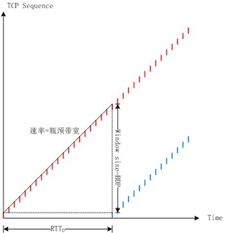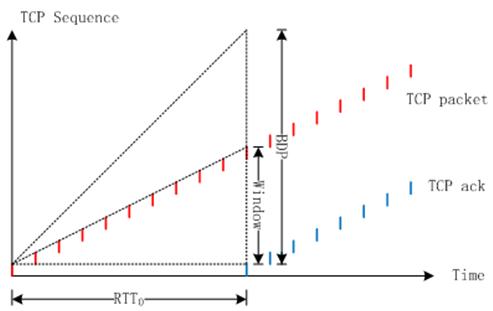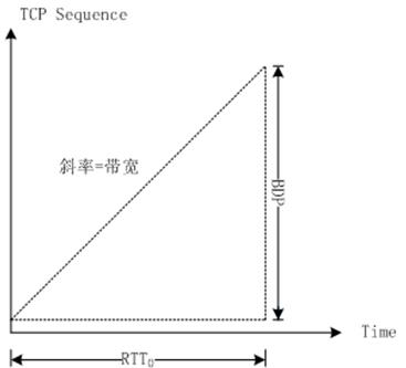 在TCP序号-时间图上,以带宽为斜率画一个直角三角形,其斜边的斜率等于带宽,水平直角边的长度等于时延RTT0,则垂直直角边的长度就等于BDP。