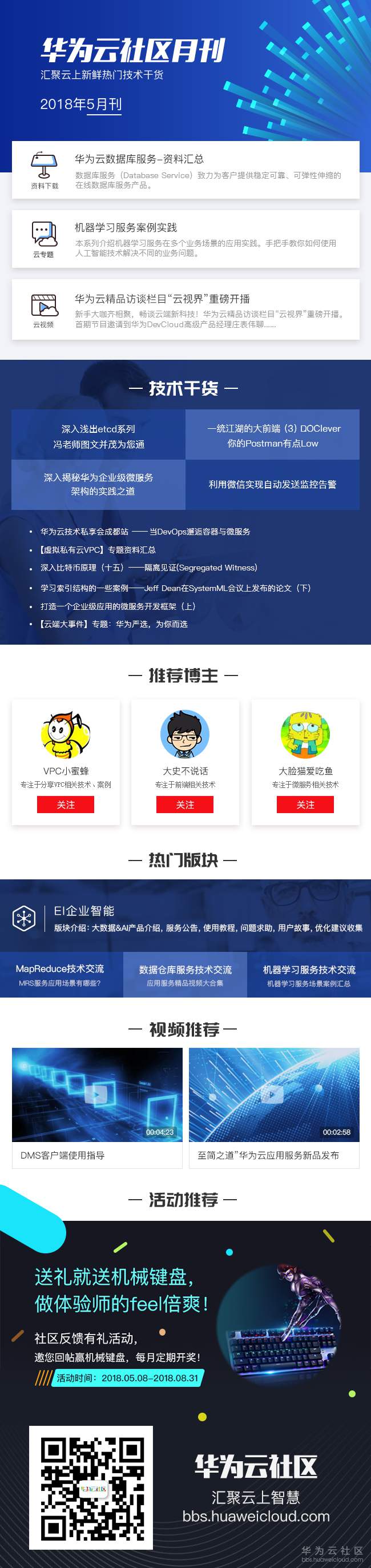【华为云社区 18年5月刊】本期推荐:华为云数据库服务资料汇总;机器学习服务案例实践;华为云精品访谈栏目“云视界”重磅开播!