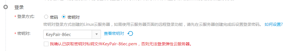 如果创建云主机时选择密钥对方式登录,如下图: