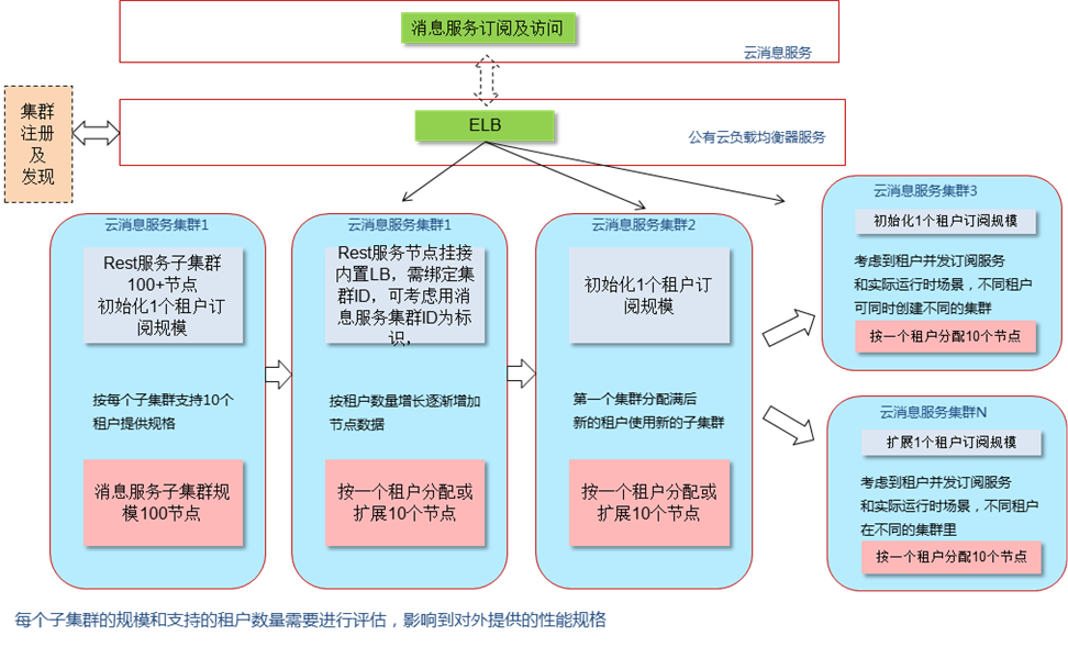 1) ELB需感知每租户到每集群的映射关系,为尽量和ELB解耦。考虑提供消息集群注册发现机制和租户与集群的对应关系,需要ELB进行集成;