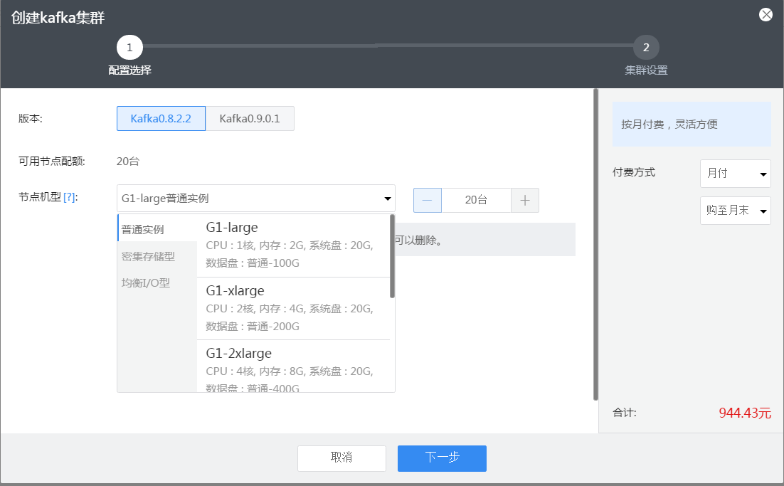 QINGCLOUD和Ucloud,这是国内的两家顶尖的云服务提供商,都有使用kafka来提供消息总线服务,从他们的官网和用户手册上可以看到相关介绍,用户创建kafka集群时,集群的节点数量都限制在20个以内,我也注册了相关的账号进行测试,发现在搭建kafka集群时,其集群的节点数量确实被限制在20个以内: