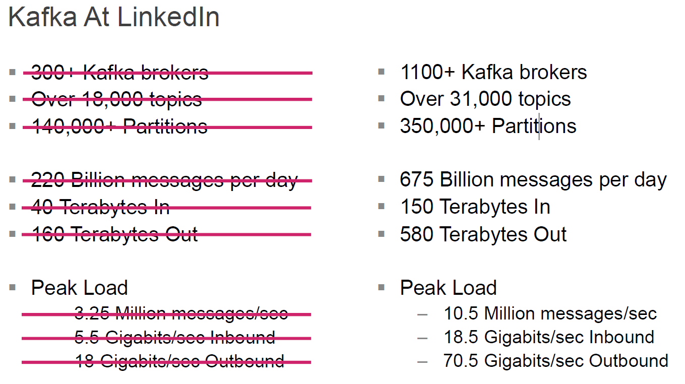 在LinkedIn的Kafka的系统上,每天有超过8000亿条消息被发送,相当于超过175TB字节的数据,另外,每天还会消耗掉650TB字节数据的消息,为什么Kafka有这样的能力去处理这么多产生的数据和消耗掉的数据,对每一种消息分类是一个重要原因。在每天系统最繁忙的时候,他们每秒接收超过1300万条消息,相当于每秒2.75GB数据。去处理这所有的信息,LinkedIn运行超过60个kafka集群,并在上面部署超过1100个Kafka节点;平均算下来,每个kafka集群内有大概20个节点。