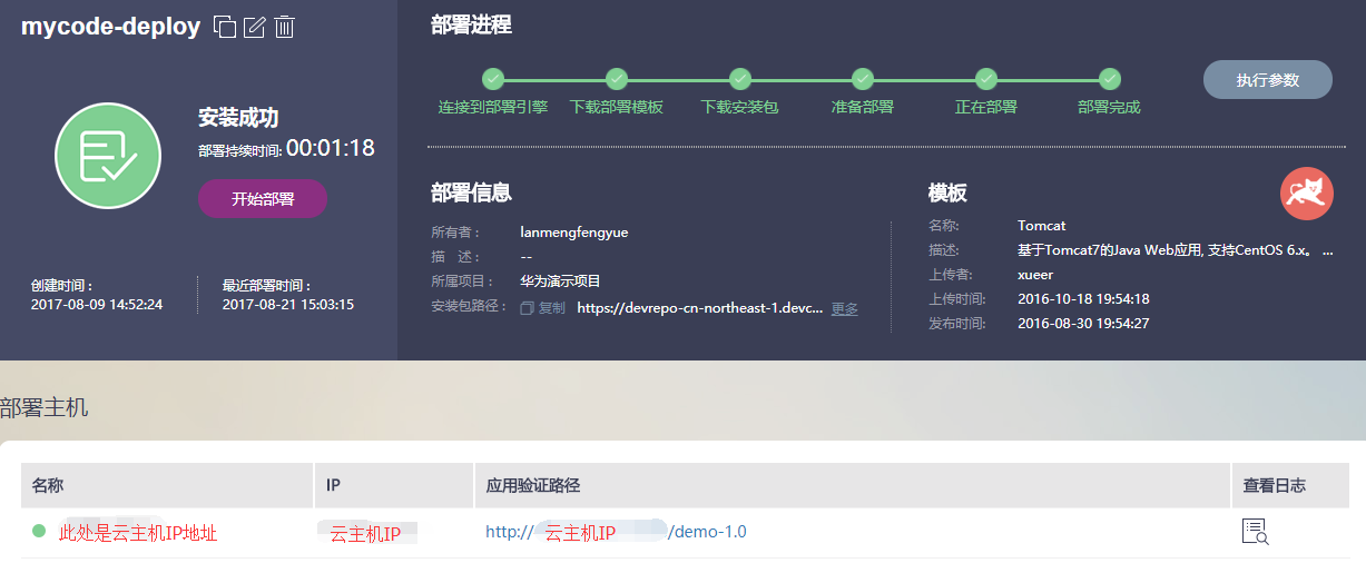 4、将项目最终的war包通过华为软件开发云部署操作自动化部署到云服务器上