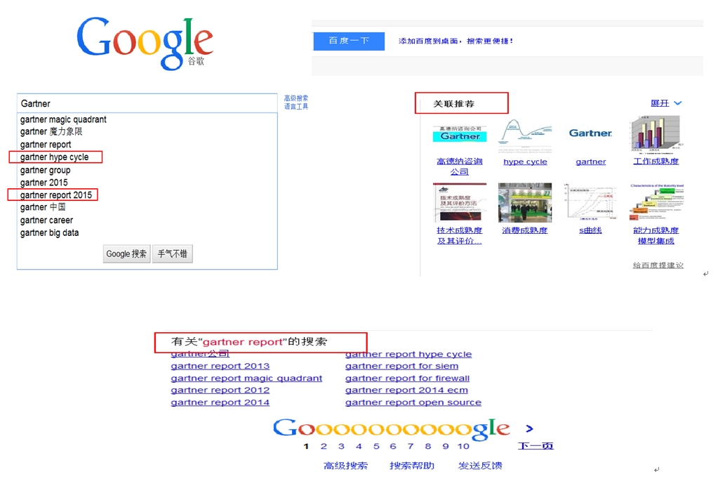 首先用到的是谷歌和百度搜索工具,英文优先用谷歌,中文优先用百度,实在不行就交叉使用。谷歌和百度网上都有很多高级的搜索技巧,在这里就不在赘述了。其中,谷歌和百度提供的“相关搜索”,“关联推荐”和“输入提示”功能,它们常常给我带来一些“意外的惊喜”。