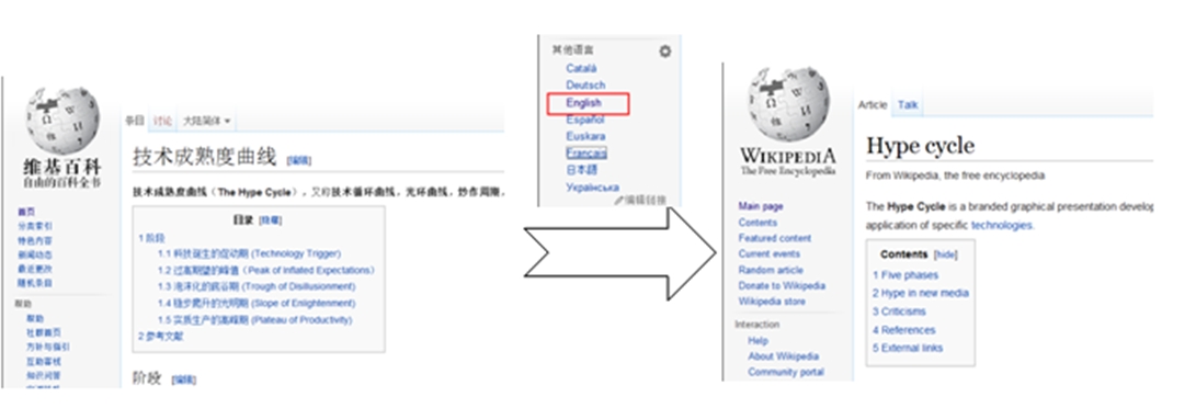 有些关键词术语,中文和英文的差异比较大,譬如“验证码”对应的英文关键词是“Completely Automated Public Turing test to tell Computers and Humans Apart”,“技术成熟度曲线”对应的英文关键词是“Hype Cycle”。如果按照字面翻译去搜索,很有可能得不到任何信息。为了得到正确的翻译术语,可以使用的工具有CNKI翻译工具,中文文献的英文摘要和Wiki语言切换。有时wiki中文会被墙掉,但是wiki其他版本并不会,你懂的!