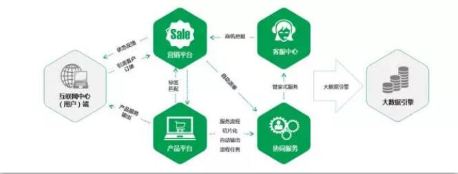 “蜂巢云平台”是通过互联网交互引入客户的,通过标签与产品服务进行匹配,同时将数据沉淀到大数据引擎中,营销平台形成订单接入项目管理并分配任务,为客户提供全生命周期的企业服务以及管家式服务。