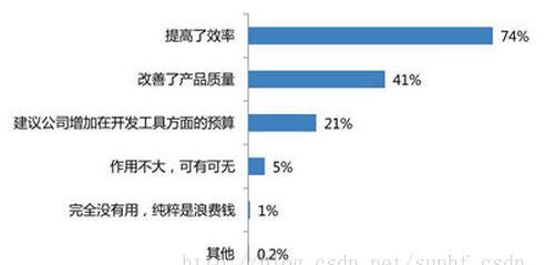 据CSDN 2016软件开发者大调查表明,有效地使用开发工具可以帮助开发者提升开发效率,提高软件产品质量,管理者也可以透明地对开发项目进行规范化管理,在CSDN这次涉及45个行业,212个地区的上万名软件开发者的大调查中,6成以上的开发团队在使用不同类型的软件开发相关工具。而高达7成的软件开发者通过实践认为合适的软件开发工具对开发有着很大的帮助,74%的开发者认为软件开发工具提高了团队的开发效率,41%的软件开发者认为软件开发工具除了能严格把控项目进度外,还能够改善和提高产品质量,21%的开发者非常期待公司在做年度计划的时候能增加在开发工具方面的预算。同时,有5成以上的企业选择把开发测试等业务支撑系统部署在云服务上。