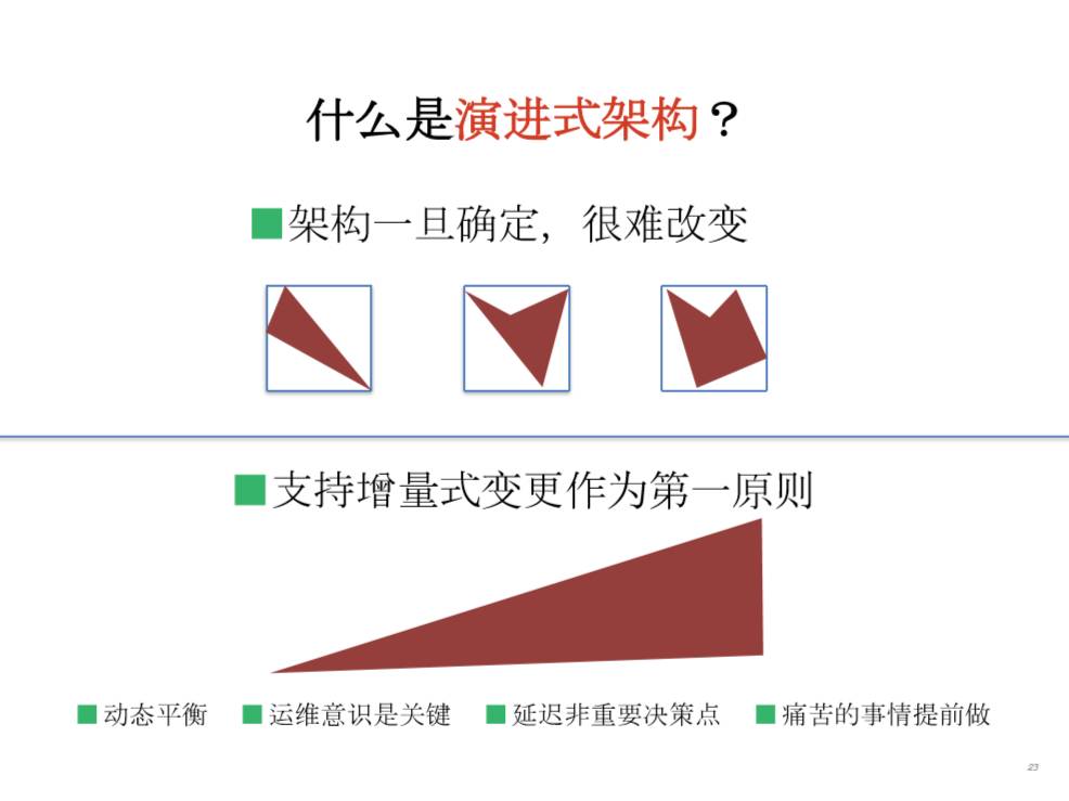 所以在社区里对于架构新的理念叫「演进式架构」,它所定义的是希望将敏捷的方式应用在架构层面,将增量式变更作为架构里面必要的一环。提到这个问题大家会想,对于架构而言,我怎么做增量式变更呢?