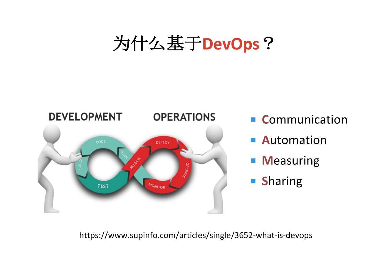 在 DevOps 体系里,相信这两天大家听了很多关于 DevOps 的介绍,我再总结一下,对于 DevOps,我认为它的最大几个核心点,就是右边的这四个英文单词——CAMS。