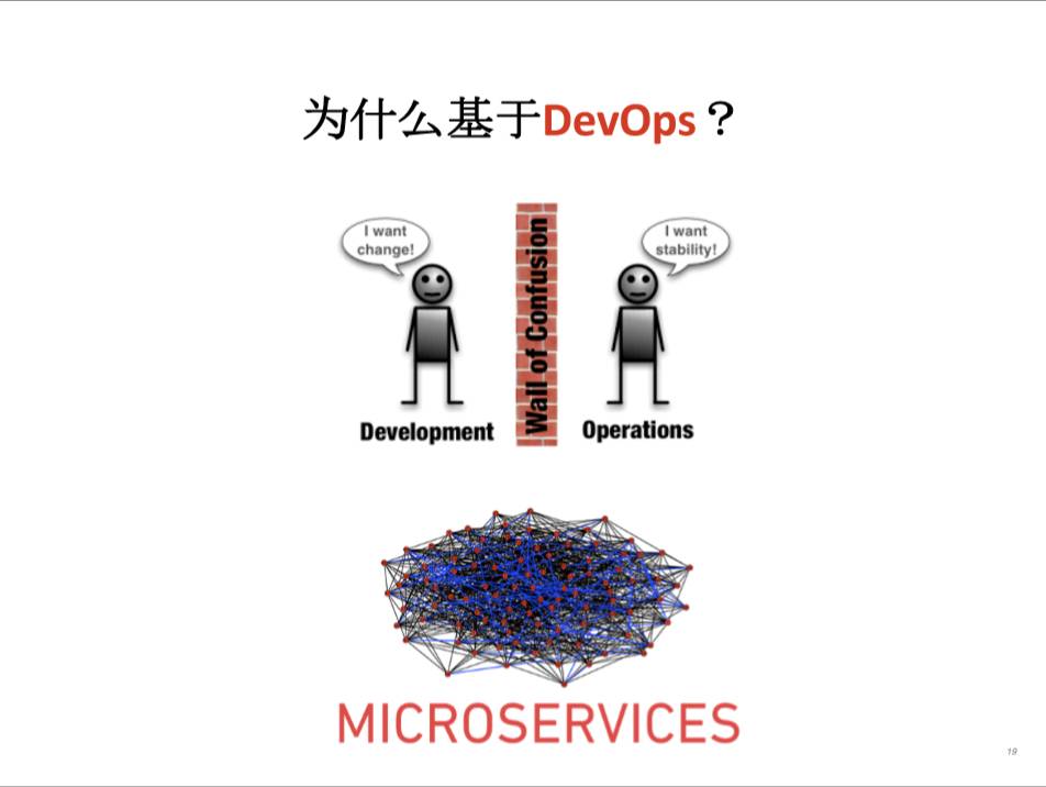 因为在一个企业里,运维团队都是稀缺资源,可能会负责公司很多产品的运维,所以这个过程中有大量的流程化手动的工作去完成部署,回到微服务架构我们想想,当我们把架构拆成多个可以被独立部署的单元的话,这个流程受到的冲击就非常大,所面临的挑战是很大的,所以对微服务与 DevOps 是相辅相成的。