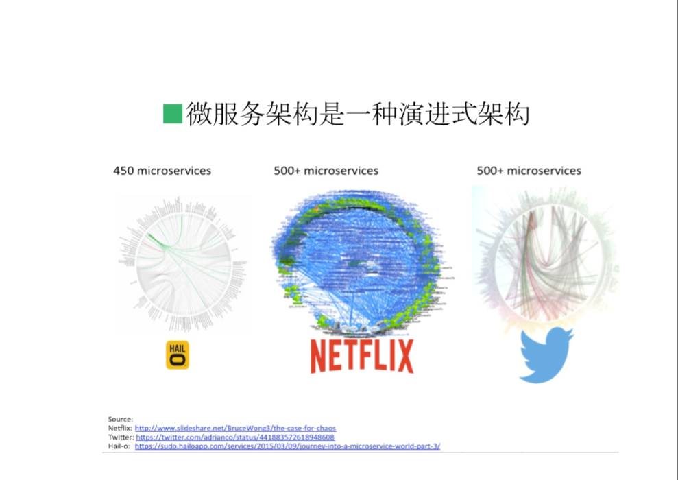 这幅图是在微服务架构领域里非常经典的几个例子,包括像Netflix,这是他们在三到五年之中对架构的结果,这张图需要多少架构师设计出来?所以我的架构更多的是通过监控、告警,能够把当前运行的状态快照出来,这是未来的架构演进的方式。所以这三点是我对微服务架构包括我们在架构层面演进的理解。