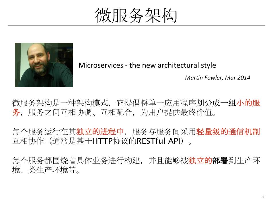 首先,Fred George 也是很早定义微服务的人。他曾经就职于IBM,还为金融、保险提供过咨询服务,在2013年的印度敏捷大会上,他第一次讲到,他们将一百多万行的银行程序,使用了非传统 SOA 的方式构建,通过持续集成,将这个服务拆分成20个,50个,200个,最后实现交付周期从一年变成一周或者几天,这是最早对微服务的介绍。
