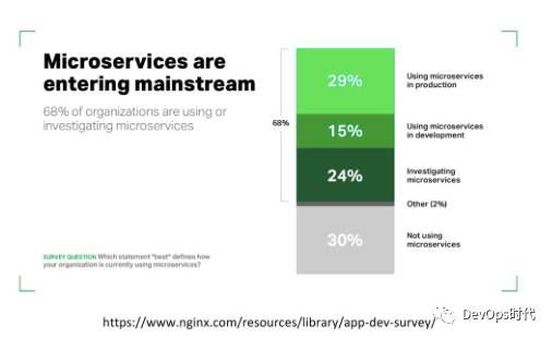 在这份报告里提到,已经接近30%的企业在使用微服务架构,而15%的企业目前正在试验开发和测试微服务架构。剩下的24%的企业正在积极学习和拥抱微服务架构。