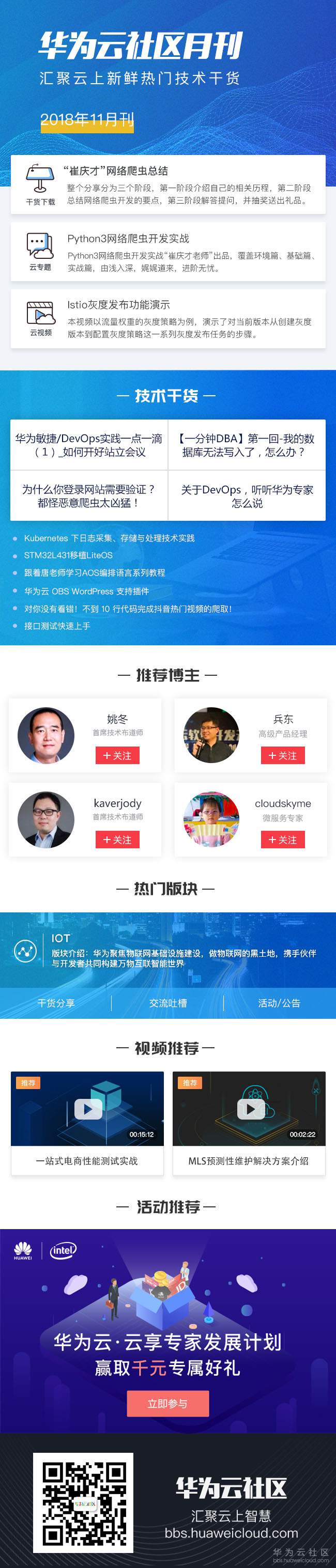 【摘要】 华为云社区月刊,每月更新一刊,欢迎大家品读。本期推荐“崔庆才”老师Python3网络爬虫开发实战从入门到进阶以及超全的网络爬虫总结,【1分钟DBA】系列内容来袭;有趣有料,定期刷新。社区云享专家发展计划也在火热进行中,推荐专家即有机会赢千元大礼。