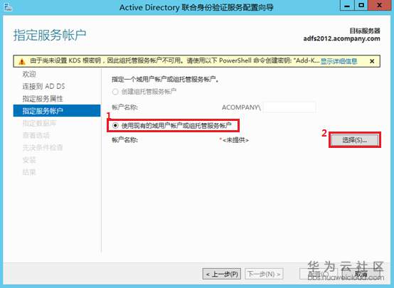 11.在“指定服务帐户”中使用已有的域管理帐户。