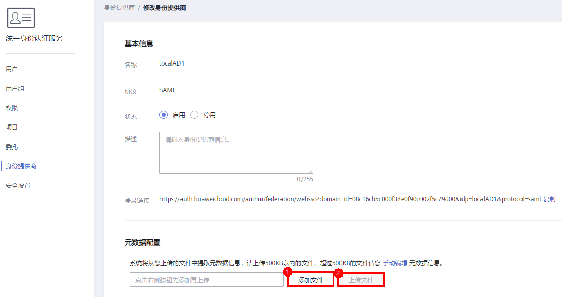 在“修改身份提供商”页面的“元数据配置”中,将1中下载的federationmetadata.xml上传。