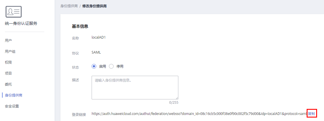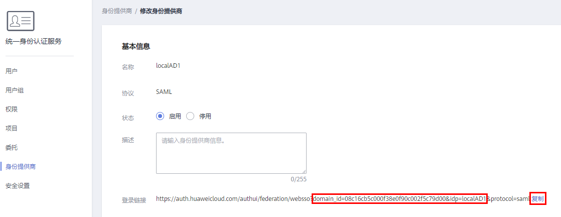 - 在“修改身份提供商”页面,查看对应的domain_id,idp。