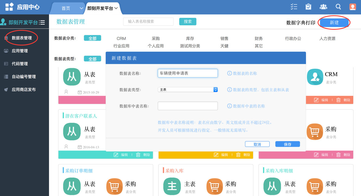 点击到数据表管理,右上角的新建主表,写上车辆使用申请表