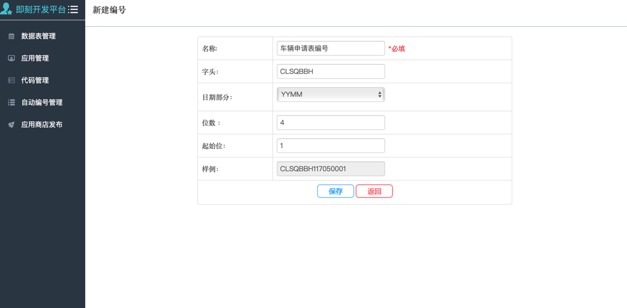 任何一个表单,不论是流程型还是标准型,建立的第一个字段都是表单的编号,编号属于字段类型的自动编码型,需要我们进行编辑,因此,我们填完字段名称和字段类型后,拖到最下端先将这个字段进行保存,进入到自动编号管理,新建编码,格式如下,然后回到第一个字段的建立,编码,将剩下的内容填完,进行保存,第一个字段就建好了(注意:只有第一个字段里高级属性的主键和只读是必勾选)。