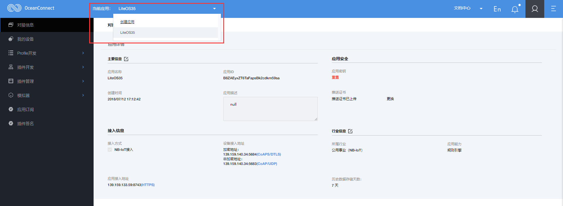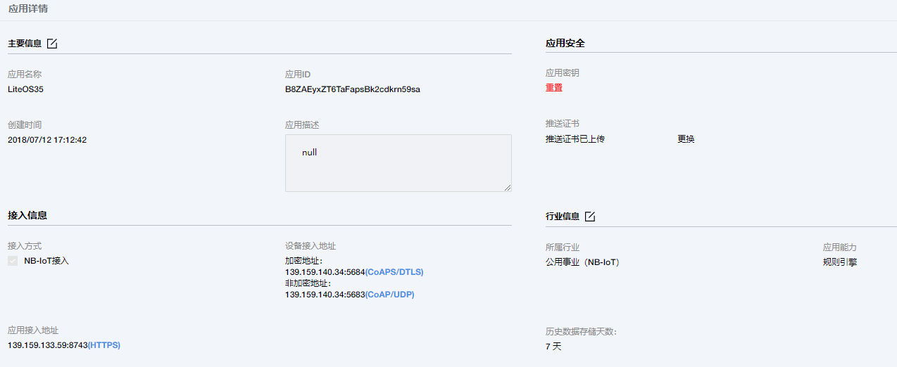 | 设备接入地址: | 南向NB-IoT设备接入的IP地址及端口号,分为加密方式和非加密方式。 |