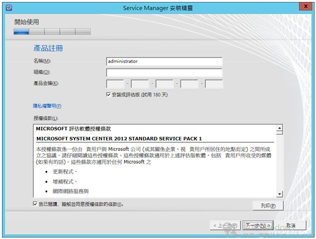 2、在“Microsoft System Center 2012”页上,单击“Service Manager 管理服务器”。在“产品注册”页上,在各个框中键入信息。 在“产品密钥”框中,键入你随 Service Manager 一起收到的产品密钥,或者选择“安装为评估版(试用期为 180 天)”。阅读 Microsoft 软件许可条款。在适当时单击“我已阅读、了解并同意许可协议的条款”,再单击“下一步”。