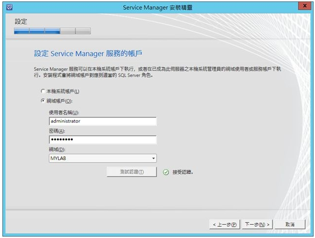 9、在“为 Service Manager 服务配置帐户”页上,选择域帐户,单击“域帐户”,指定该帐户的用户名、密码和域,然后单击“测试凭据”。在收到“凭据已被接受”消息后,单击“下一步”。