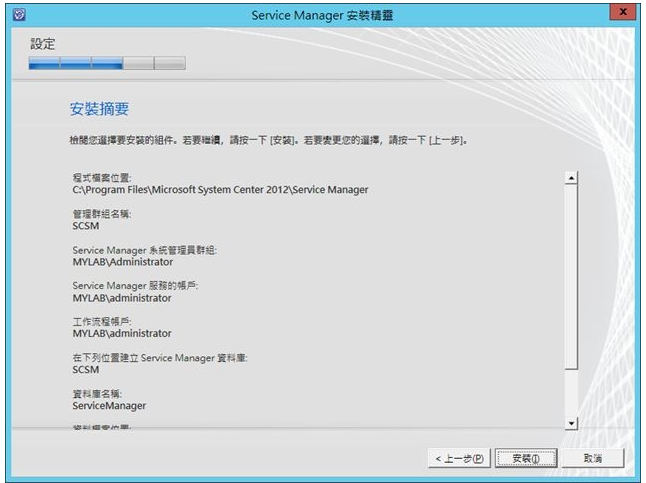 此方案适用于评估目的,而System Center 2012 Service Manager本是一超大超复杂系统,具体的应用和规划部署方案,详见官网。在安装过程中,系统将提示你提供下列帐户: