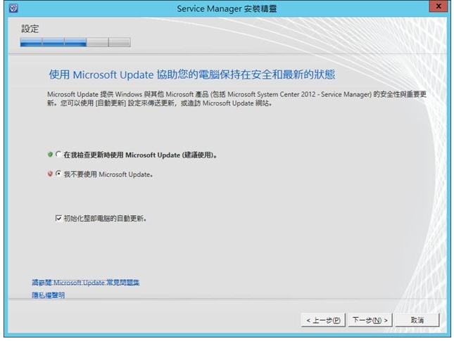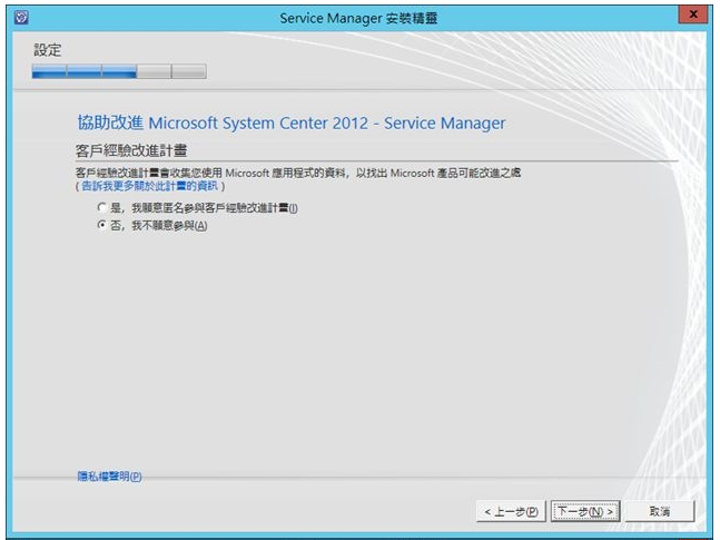 9、在“帮助改进 System Center Service Manager”页上,指示与参加客户体验改善计划有关的首选项。(可选)单击“告诉我有关此计划的更多信息”,再单击“下一步”。在“使用 Microsoft 更新帮助保持你的计算机安全和最新”页上,指示与你使用 Microsoft 更新来检查 Service Manager 更新有关的首选项。 如果想要 Windows 更新检查更新,请选择“启动计算机范围的自动更新”。单击“下一步”。
