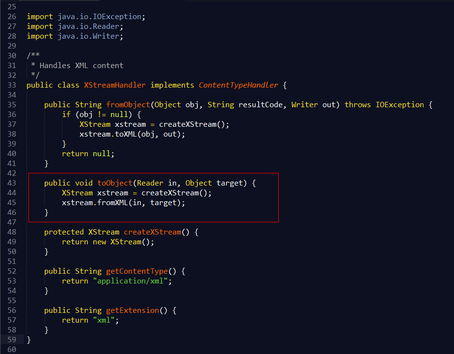在Struts-2.5.13(2017年9月5日紧急补丁版本)之前的版本中(我们选取了2.5.10.1版本),其中XStreamHandler.java(path:"/src/plugins/rest/src/main/java/org/apache/struts2/rest/handler/XStreamHandler.java")中代码如下: