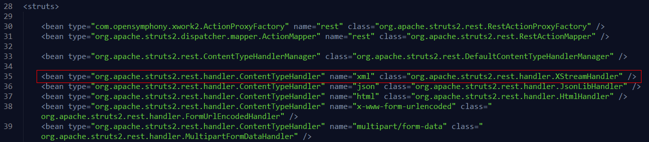 上述配置文件中,针对xml的反序列化,利用了org.apache.struts2.rest.handler.XStreamHandler类