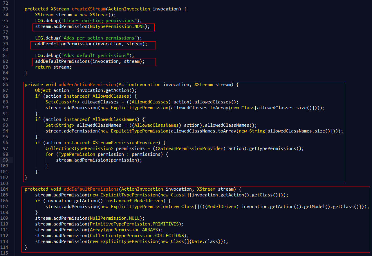 上述代码在之前版本的基础上,主要增加了两个方法addPerActionPermission和addDefaultPermissions,并在createXStream方法中,在实例化一个XStream()对象后,首先调用stream.addPermission(NoTypePermission.None)在擦除其现有的全部权限,然后调用上述两个方法添加action的授权和默认的授权。