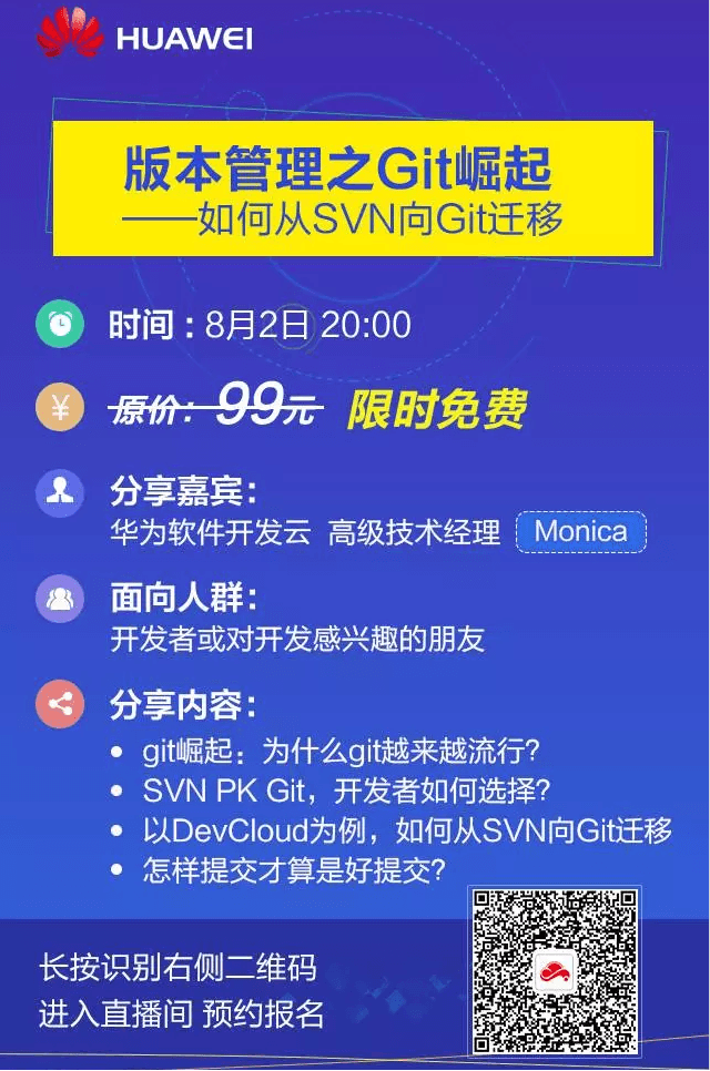 8月2日(下周三),华为软件开发云为你带来限免公开课《版本管理之Git崛起——如何从SVN向Git迁移》,马上预约报名,还有四重大礼等你拿:
