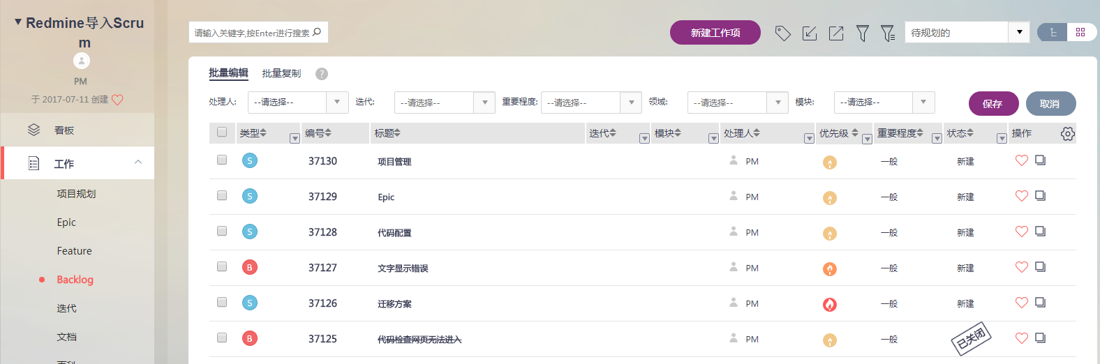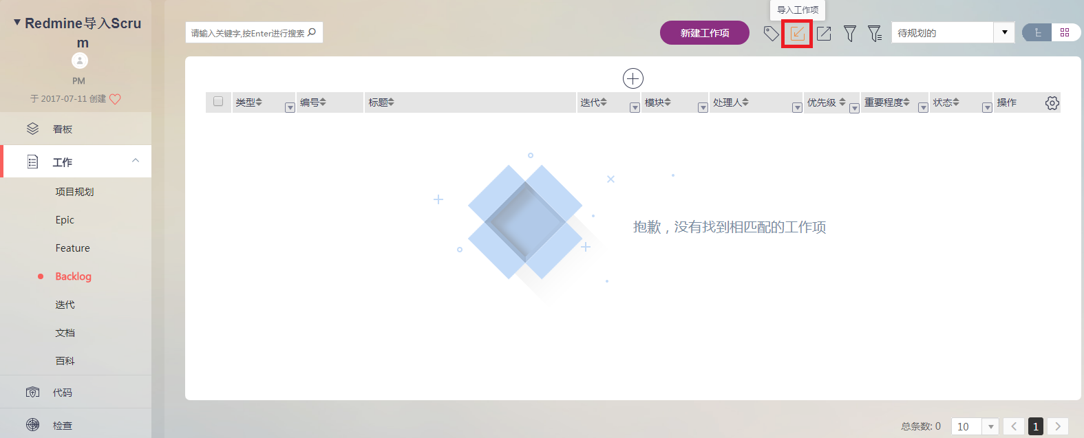 2、进入【工作】标签的【Backlog】界面中