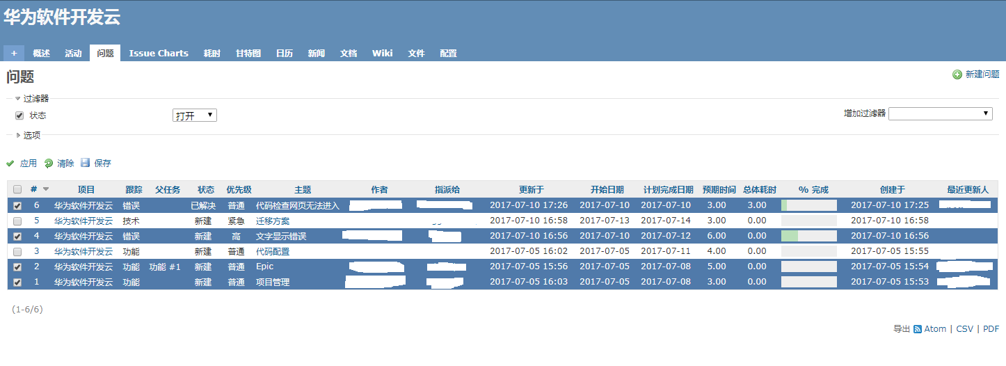 我们可以用Redmine的导出功能,将项目中数据的所有信息全部导出到CSV文件中,然后根据开发云的导入模板,将Redmine的数据填充到开发云的模板中,最后将数据导入到开发云中。