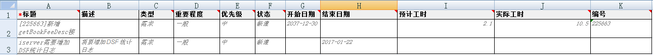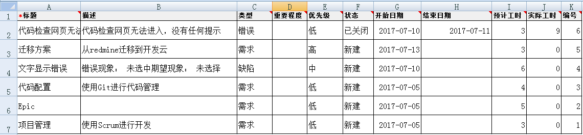 根据开发云导入模板的关键值,我们选出Redmine导出数据中对应的关键值