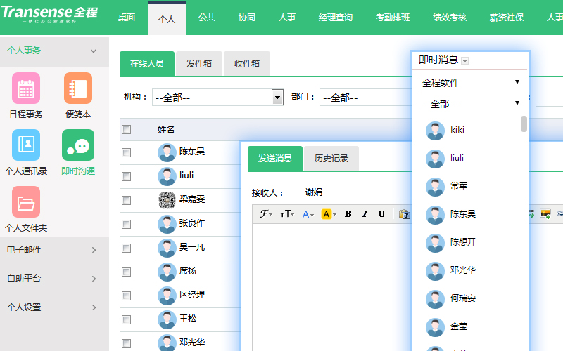 可轻松对企业内部的所有人员发起对话,不需要添加好友,方便、快捷;全面打造企业内部即时沟通平台,是企业内部的QQ、IM沟通工具,客户端支持直接发送图片和文件,减少企业内部通讯费用,提高员工沟通效率。