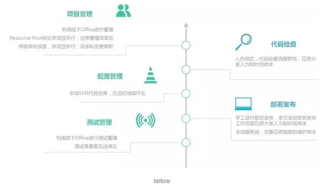 项目管理。传统的瀑布模型很难适应当前软件开发环境,需求变更越来越频繁,缺乏有效的变更管理。利用线下Office进行项目管理效率低,并且无标准化的项目管理流程,无法实现信息透明化。另外,多项目并行,采用人力资源池模式,任务工作项等管理困难。