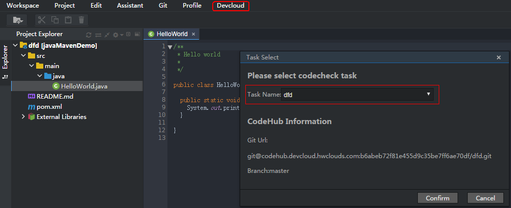 1、单击“DevCloud > CodeCheck”菜单,弹出“Task Select”选择框