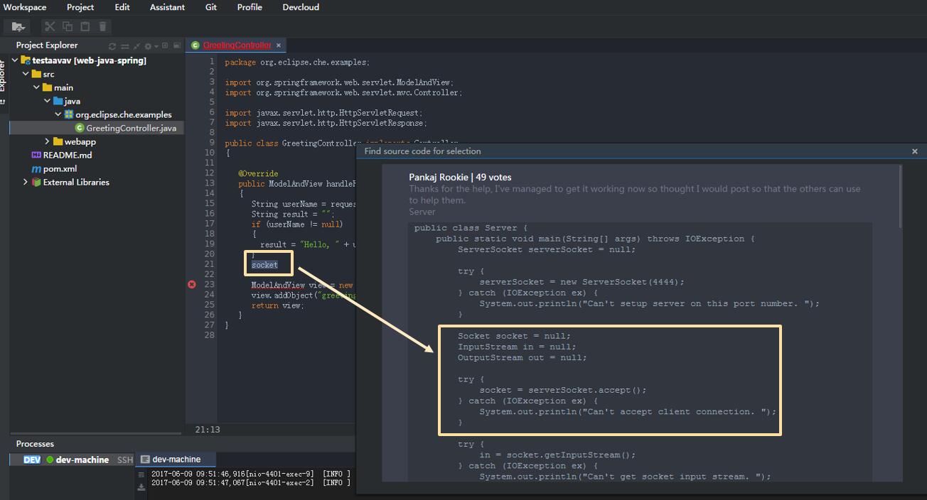 有了CloudIDE,这些都不用了!只要输入“socket”, 然后使用快捷键”Alt+S”(或在菜单里单击”Assistant > Sourcecer > Find source code for selection”),所有这些事情,一步帮你搞定。更厉害的是,CloudIDE会识别的你代码语言,自动帮你找到对应语言的代码!是不是感觉飞起来啦?!