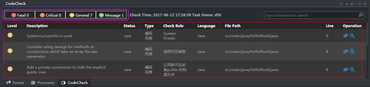 4、在“CodeCheck”面板右上角搜索栏内,可以输入关键字对缺陷进行搜索。