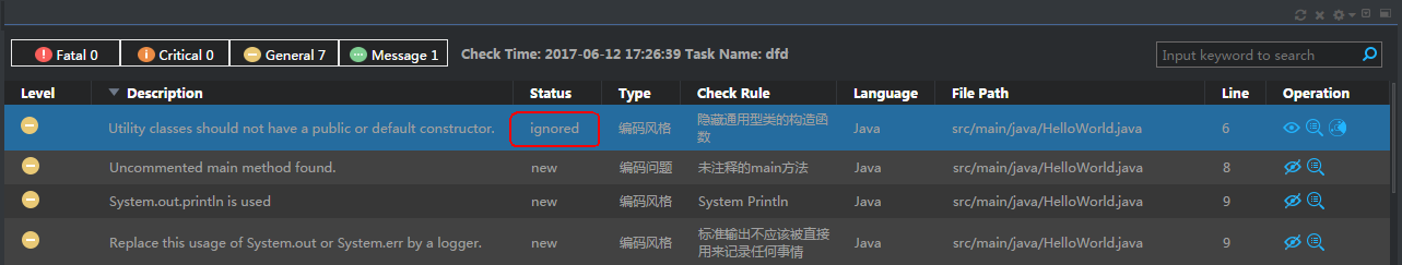 6、对缺陷列表中的缺陷设置忽略按钮,在“Ignore”弹窗中输入忽略原因后,单击“OK”。设置忽略后,该缺陷的状态显示为“ignored”