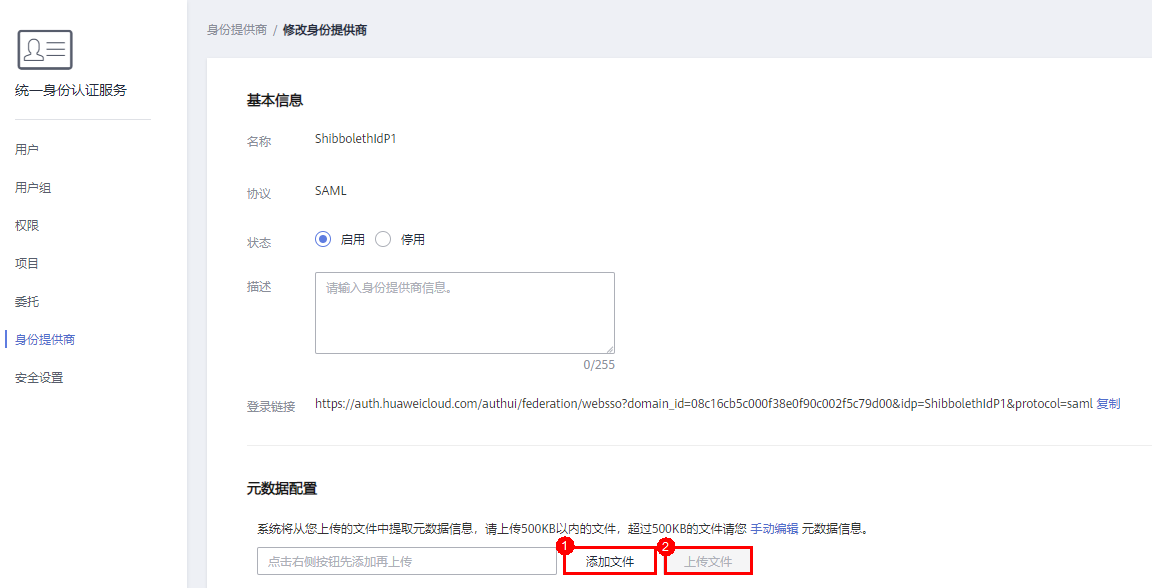 3. 单击界面提示中的“修改身份提供商”,在页面中“元数据配置”区域配置企业IdP系统的元数据,即上传“C:\Program Files (x86)\Shibboleth\IdP\metadata\idp-metadata.xml”文件。