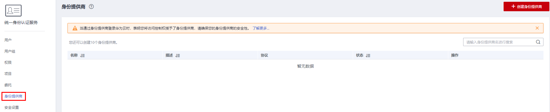 1. 企业管理员使用已注册的华为云账户登录华为云,并进入IAM控制台,在控制台左侧导航栏中单击“身份提供商”,单击“创建身份提供商。