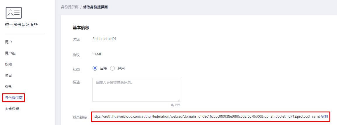 5. 在“修改身份提供商”页面,复制登录链接,并在浏览器中打开。