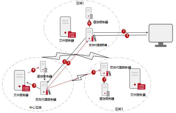 各个地域的文档服务器默认彼此之间没有文档数据交换,彼此之间仅同步元数据信息以及用户数据信息,以保证分散在各个地域的用户所能够看到的文件视图是相同的。 某个地域的用户产生的文件数据就近存放在该用户所在地的文件服务器中。在各分支结构中,各个地域内部之间数据访问以及交互的场景占据了绝大多数比例,仅有少量的业务数据需要跨地域访问。因此,这种数据就近访问的方式,特别适用于网络带宽较小的应用场景。当用户需要访问其他地域数据时,首先冲向访问本地域反向代理服务器。