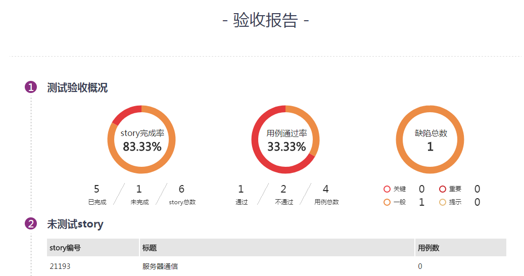 然后华为软件开发云还提供验收报告功能,通过验收报告功能我们可以一目了然的多维度的把握当前测试的进度。
