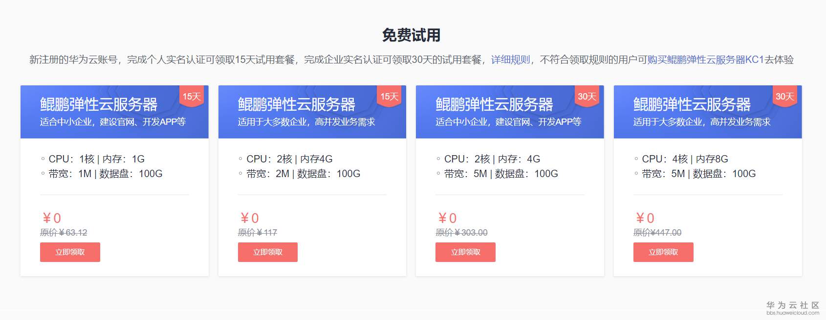 根据自己的实际情况领取所需的鲲鹏弹性云服务器(如果已完成个人实名认证的,可以领取前两个;如果是企业实名认证的,可以体验后两个)